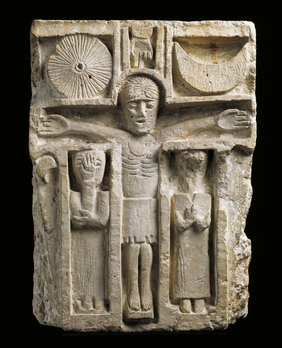 Crucifixion de Villars-les-MoinesAtelier inconnuDatationMilieu du XIe s. CatégorieReliefMatériaux / TechniquesPierre calcaireDimensionsObjet: 58 x 42 x 21 cmN° d'inventaireMAHF 7556ExposéCommander photo© Copyright